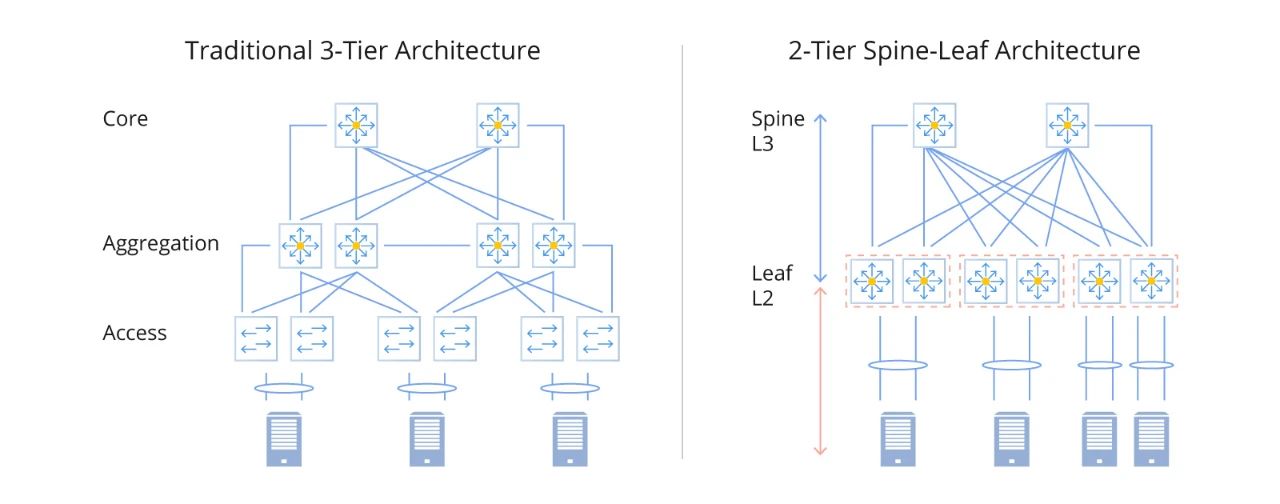 800G光模塊需求的激增與數(shù)據(jù)中心網(wǎng)絡(luò)架構(gòu)的變化密切相關(guān)。傳統(tǒng)的三層架構(gòu)(包括接入層、聚合層和核心層)多年來(lái)一直是標(biāo)準(zhǔn)。隨著AI技術(shù)規(guī)模和東西向流量的不斷擴(kuò)大,數(shù)據(jù)中心網(wǎng)絡(luò)架構(gòu)也在不斷演進(jìn)。在傳統(tǒng)的三層拓?fù)渲校?wù)器之間的數(shù)據(jù)交換需要經(jīng)過(guò)接入交換機(jī)、匯聚交換機(jī)和核心交換機(jī),這給匯聚交換機(jī)和核心交換機(jī)帶來(lái)了巨大的壓力。