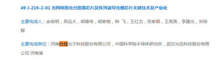 《光網(wǎng)絡(luò)用光分路器芯片及陣列波導(dǎo)光柵芯片關(guān)鍵技術(shù)及產(chǎn)業(yè)化》主要完成單位:河南仕佳光子科技股份有限公司、中國科學(xué)院半導(dǎo)體所、武漢光迅科技科技股份有限公司 河南省。主要完成人:安俊明,吳遠(yuǎn)大,胡雄偉,胡家燕,鐘飛,王紅杰,張家順,王亮亮,李建光,宋瓊輝。