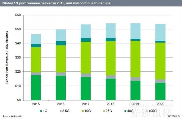 IHS Markit表示,全球1G端口收入在2015年達(dá)到頂峰,并將繼續(xù)下降。