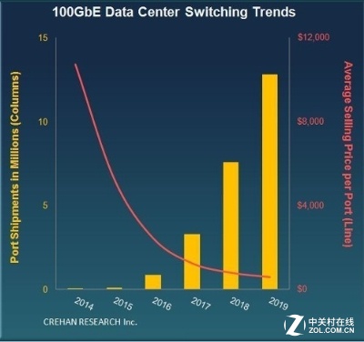Crehan Research的調(diào)查報告預(yù)測,到2019年,100G以太網(wǎng)端口的出貨量將從現(xiàn)在的數(shù)以萬計增長至1000萬以上,而每個端口的成本價格將在2016年呈現(xiàn)顯著降低的趨勢。