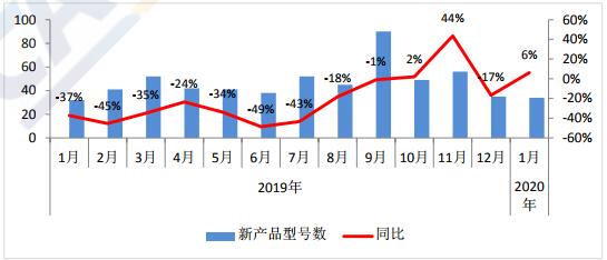 在國內(nèi)手機(jī)市場(chǎng)上市新機(jī)型方面,2020年1月,上市新機(jī)型34款,同比增長(zhǎng)6.3%,其中2G手機(jī)8款、4G手機(jī)18款、5G手機(jī)8款。