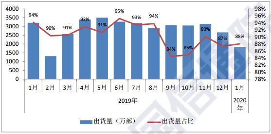 在智能手機(jī)出貨量方面,2020年1月,智能手機(jī)出貨量2036.6萬部,同比下降36.6%,占同期手機(jī)出貨量的97.8%,其中Android手機(jī)在智能手機(jī)中占比88.7%。