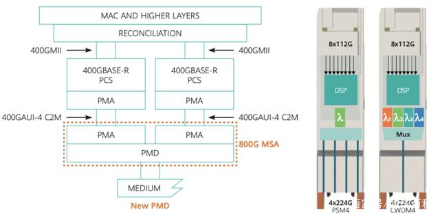 ICC訊 基于單通道200G的PAM4 技術(shù),是光強度調(diào)制和直接檢測互連的下一代技術(shù)的主要階段,它將成為4通道800G光連接的基礎(chǔ),也是未來1.6Tb/s 互連的重要構(gòu)建基礎(chǔ)。如下圖所示,MSA工作組將定義完整的PMD 和部分PMA層規(guī)范,包括新的低功耗、低延遲FEC 作為112G電信輸入信號KP4 FEC頂部的封裝,以提高調(diào)制解調(diào)器的凈編碼增益 (NCG)。