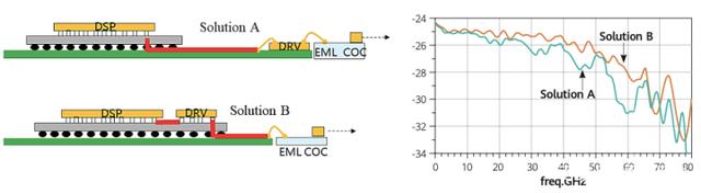 對于4x200G光模塊,需要重新考慮其發(fā)射器和接收器的封裝,以確保在奈奎斯特頻率點 (56GHz)下范圍內(nèi)的信號完整性。下圖顯示了發(fā)射器的兩種可能的解決方案。方案A是傳統(tǒng)方案,調(diào)制器驅(qū)動器(DRV)與調(diào)制器(如EML)緊靠在一起;在方案B中,則是基于倒裝設(shè)計的 DRV芯片與DSP 單元共同封裝在一起,以優(yōu)化 RF 傳輸線路上的信號完整性。這兩種解決方案都可以通過現(xiàn)有的技術(shù)來實現(xiàn)。