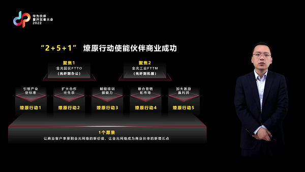 為加速F5G在商業(yè)市場落地,為伙伴提供更好的支持,華為光產(chǎn)品線總裁靳玉志發(fā)布了星光計(jì)劃2022之燎原行動,投入1億元用于伙伴激勵(lì),并提供各類支撐,計(jì)劃將合作伙伴數(shù)量由500家提升至5000家。 華為中國政企光解決方案銷售部總經(jīng)理錢一波表示,華為希望攜手伙伴,讓F5G能夠打通伙伴在商業(yè)市場成功的最后一公里,通過2個(gè)聚焦、5大行動、1個(gè)愿景,使能伙伴的商業(yè)成功,合力打造商業(yè)市場第一品牌。