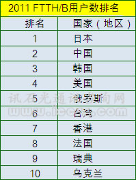 日本FTTH/B用戶數(shù)依舊保持世界第一,中國緊隨其后。但在增長上,這兩個國家則呈現(xiàn)出明顯不同。中國的表現(xiàn)更為積極, 2011年下半年較上半年增長44%,而日本僅有6%。這一趨勢只會變得更強,因為在2011上半年,各自的增長率為14%和5%。這一趨勢將很快在擁有最多FTTH/B用戶數(shù)全球排名上,使得中國和日本調(diào)換位置。