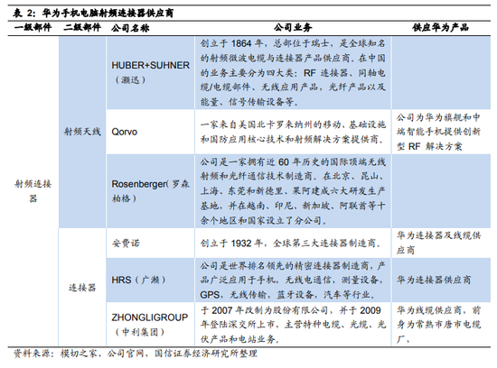 2)射頻連接器供應(yīng)商主要分為射頻天線供應(yīng)商灝迅、Qorvo、羅森佰格;連接器供應(yīng)商主要有安費(fèi)諾、廣瀨和中利電子。