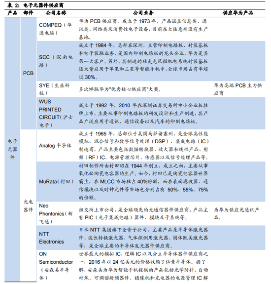 從整體看,華為上游電子元器件供應(yīng)商覆蓋從基礎(chǔ)PCB印刷電路板到用于電路邏輯設(shè)計(jì)的元器件,PCB的核心廠商以國內(nèi)為主,包括生益科技、深南電路、滬電股份等,電子元器件主要采用美國和日本廠商的產(chǎn)品,包括村田和德州儀器等。