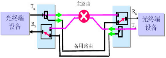 在傳統(tǒng)的有源的WDM系統(tǒng)中,一般使用兩條光纜路由,其中一條用于工作線路,另一條用于保護(hù)線路。正常情況下,設(shè)備工作在工作線路上,當(dāng)發(fā)生線路意外,例如工作線路(光纜)發(fā)生斷纖或者性能下降時(shí),設(shè)備通過OLP(Optical Line Protection)[4,5]板會(huì)自動(dòng)切換到保護(hù)線路(光纜)上,以保證業(yè)務(wù)部發(fā)生中斷。另外,設(shè)備對(duì)保護(hù)線路具有實(shí)時(shí)監(jiān)測(cè)功能,當(dāng)保護(hù)線路發(fā)生斷纖或性能下降時(shí),設(shè)備也會(huì)及時(shí)監(jiān)測(cè)到,以便及時(shí)進(jìn)行返回處理(恢復(fù)原樣)。因此,WDM設(shè)備的保護(hù)對(duì)象是光層上的傳輸線路,通過OLP板實(shí)現(xiàn)光線路保護(hù),提高了網(wǎng)絡(luò)的可生存性。這也就是OLP保護(hù)與OCP(光通道保護(hù))和OMSP(光復(fù)用段)保護(hù)的本質(zhì)區(qū)別之所在。