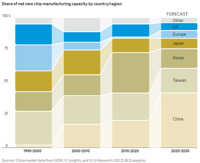 華爾街日?qǐng)?bào)認(rèn)為,如果按照目前的趨勢(shì)繼續(xù)發(fā)展下去,未來幾年中國(guó)大陸的產(chǎn)能迅速增長(zhǎng),而美國(guó)在芯片制造領(lǐng)域的份額將進(jìn)一步縮小。在2030年,中國(guó)大陸預(yù)計(jì)將成為最大的半導(dǎo)體生產(chǎn)工廠。