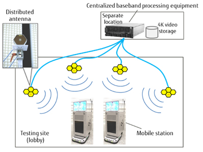 測(cè)試系統(tǒng)包括兩個(gè)移動(dòng)站配備顯示在 Fujitsu Shin-Kawasaki科技廣場(chǎng)內(nèi),以及安裝在16個(gè)不同位置的分布式天線,集中式的基帶處理設(shè)備和光纖電纜連接的分布式處理設(shè)備。多達(dá)32分布式天線可以由集中式的基帶出庫(kù)設(shè)備集中控制,并且使分布式天線之間能達(dá)到較高精度的校正。Fujitsu能通過(guò)分布式天線之間阻止信號(hào)的干擾。這種配置使系統(tǒng)測(cè)試技術(shù)更容易達(dá)到商業(yè)化5G技術(shù)。值得注意的是,移動(dòng)站使用分布式天線的能力處理高達(dá)32流的數(shù)據(jù)傳輸能力,這樣的速度在行業(yè)內(nèi)是第一。
