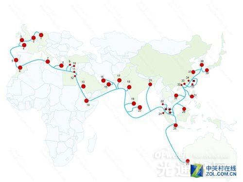 亞歐海底光纜(South-East Asia - Middle East - Western Europe 3,即SEA-ME-WE 3),是目前世界上耗資最大、長度最長(3.9萬公里)、途經(jīng)國家和地區(qū)最多的海底光纜,采用2對纖芯,每對48*10 Gbps DWDM光纖技術(shù),光纖容量為960Gbps,其中大陸地區(qū)的登陸站為上海和汕頭。