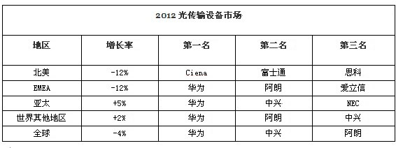 來自北美和EMEA(歐洲、中東和非洲)地區(qū)下降了12%,雖然部分由亞太地區(qū)和世界其他地區(qū)所抵消,但全球整體上還是下降了。排在前三位的華為、中興和阿朗,這三家的市場營收占了的市場份額。
