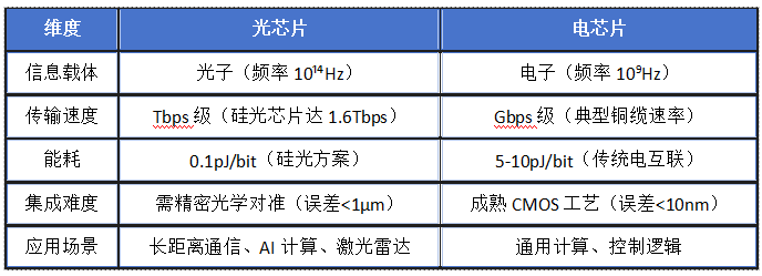 光芯片與電芯片的本質差異體現(xiàn)在信息載體、能耗與應用場景等幾個方面。光子以101?Hz頻率傳輸,支持Tbps級速率且能耗低至0.1pJ/bit;而電子受限于109Hz 頻率,速率與能耗均處于劣勢。這種差異決定了光芯片在長距離通信、AI計算等場景的不可替代性,而電芯片則在通用計算、控制邏輯等領域持續(xù)發(fā)揮價值。