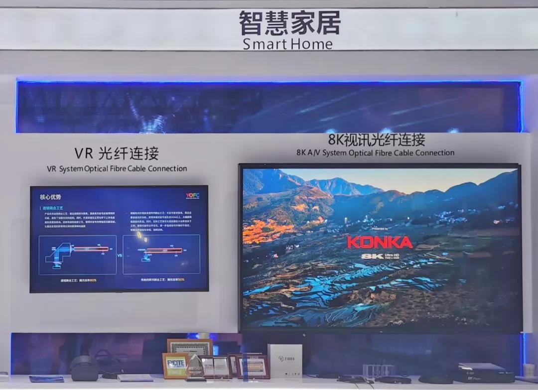 5G時代的高帶寬、低時延特性,極大地滿足了下游產(chǎn)業(yè)鏈 “零”距離、超高清、實時化交互的應用場景,驅動了8K、VR等應用的迅猛發(fā)展。此次長飛公司智能家居展區(qū),模擬實景家居場景,展示具有超大帶寬的8K HDMI光纖線材的優(yōu)異傳輸能力,通過對比實驗,差異化體現(xiàn)出長飛公司AOC線纜相對傳統(tǒng)銅纜在畫質與傳輸性能上的優(yōu)勢。同時展出的高帶寬低時延VR光纖線,使用特制柔性線材,無懼電磁干擾,更能滿足VR使用過程中幅度變化大的特性。
