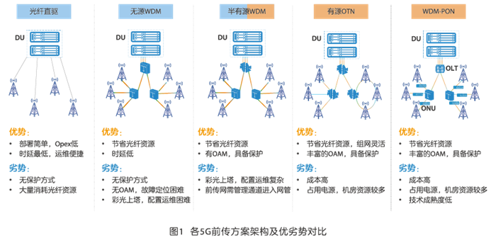 以上五種前傳方案均能滿足5G前傳帶寬、時延、傳輸距離等性能指標(biāo)要求,但具有不同的技術(shù)特點,在建設(shè)成本、建設(shè)難度和維護(hù)成本等方面均有差異。