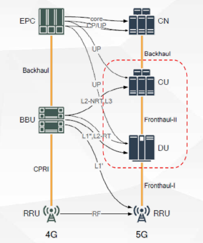 4G RAN組網(wǎng)采用DRAN和CRAN 2種方案。為了解決機房空間、動力配套、租金增加等問題,同時考慮未來DU池組化以及在成本和網(wǎng)絡的演進,5G RAN組網(wǎng)主要采用CRAN模式,實現(xiàn)DU大集中或者小集中。