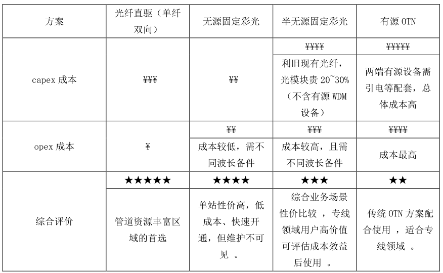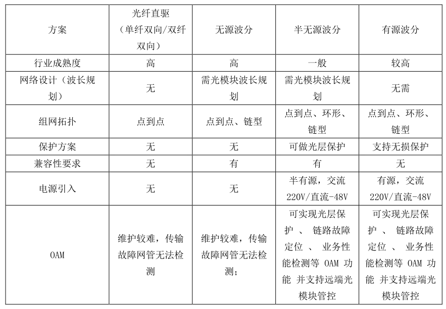 從網(wǎng)絡規(guī)劃、組網(wǎng)、保護方案、兼容性、電源引入及網(wǎng)絡運營OAM上對比各種前傳方案(見表1)。