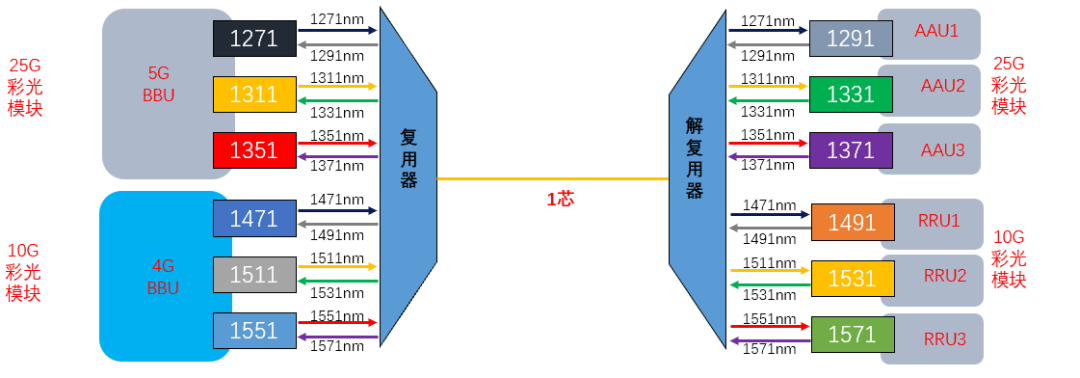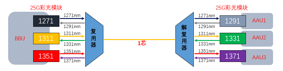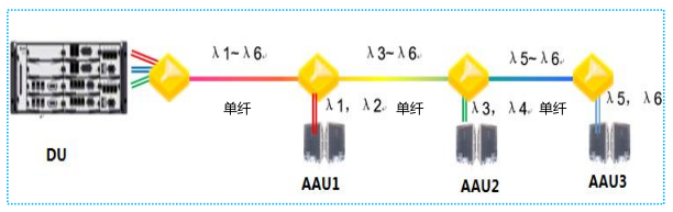 DU設備3個光口分別使用不同波長的彩光模塊(前6波波長1 271 nm、1 291 nm、1 311 nm、1 331 nm、1 351 nm、1 371 nm),與合分波設備連接,合波到1芯后,拉遠到遠端AAU側(cè)的合分波設備分波恢復為6波,再通過不同波長的彩光模塊一一對應連接到3個AAU設備的光口上。