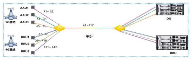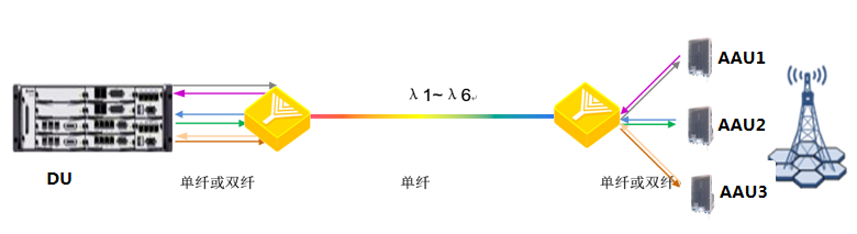 在局端的DU側(cè),采用有源的WDM或者OTN接入型設備;在遠端的AAU側(cè),有源方案需增加單獨的有源設備,半有源方案則無需新增設備,直接用彩光模塊接入AAU設備。