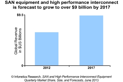 Infonetics公司預(yù)測,到2017年SAN和高性能互連(HPI)設(shè)備市場將達90億美元,隨著HPI運用10GE、40GE和100GE作為數(shù)據(jù)中心傳輸成為常態(tài)。