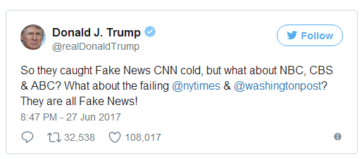 他們把假新聞CNN抓了個正著,那NBC,CBS(56.74, 0.00, 0.00%),ABC呢?失敗的《紐約時報》和《華盛頓郵報》呢?全都是假新聞!