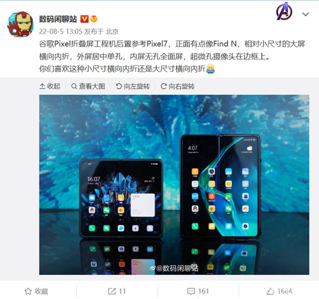 關(guān)于外觀造型,最新的微博消息顯示,谷歌的這款折疊屏手機(jī)后置部分參考了Pixel7,正面造型很像Find N,屏幕采用橫向內(nèi)置的方案。外屏居中單孔,內(nèi)屏是無(wú)挖孔的全面屏,超微孔攝像頭在邊框上。