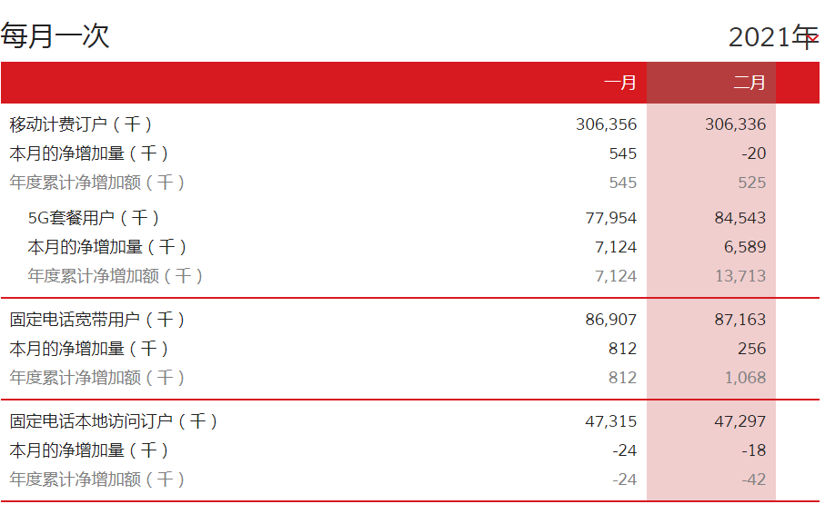 中國聯(lián)通官網(wǎng)消息,中國聯(lián)通公布2021年2月份運營數(shù)據(jù),2月移動客戶數(shù)減少2萬戶,移動客戶總數(shù)為3.06336億戶。2月5G套餐用戶凈增加658.9萬,共8454.3萬戶。