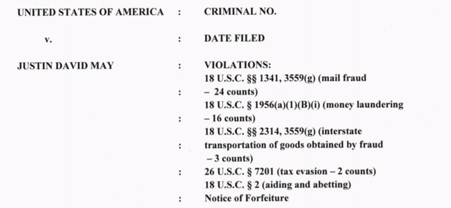 直到被捕時,賈斯汀·大衛(wèi)·梅一共犯下了42宗郵件欺詐、10宗網絡洗錢、3宗州際運輸欺詐和2宗逃稅。