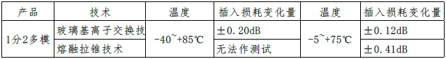 玻璃基離子交換型多模光分路器工作溫度在-40~+85℃,插入損耗隨溫度變化而變化量較小;熔融拉錐型多模光分路器通常工作溫度在-5~+75℃,插入損耗隨溫度變化的變化較大,特別是在低溫條件下(<-10℃),插入損耗較不穩(wěn)定。為了保持其性能的穩(wěn)定性,會增加能源消耗,而玻璃基離子交換型則沒有這個問題。