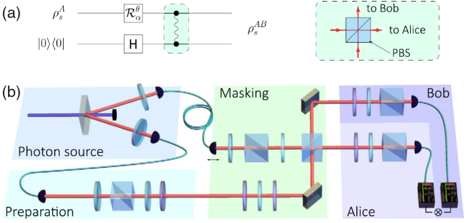 量子信息掩蔽的工作原理和實驗實現(xiàn)。(a)邏輯線路圖,(b)實驗裝置圖