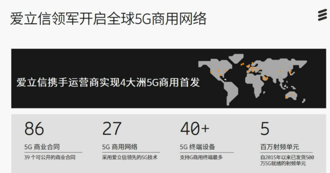 “5G正在全球范圍內(nèi)加速前行,愛(ài)立信正在領(lǐng)軍開(kāi)啟全球5G商用網(wǎng)絡(luò),是參與5G技術(shù)試驗(yàn)和商業(yè)部署最多的供應(yīng)商?!睋?jù)趙鈞陶介紹:“截至目前,愛(ài)立信攜手運(yùn)營(yíng)商實(shí)現(xiàn)4大洲5G商用首發(fā),目前已經(jīng)斬獲86個(gè)5G商業(yè)合同,其中愛(ài)立信已經(jīng)與39家運(yùn)營(yíng)商客戶達(dá)成可公示的商用5G合同。