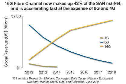 Infonetics數(shù)據(jù)中心和云分析師:“隨著16G光纖通道的快速升溫,8G是正在消退。16G光纖通道解決方案占存儲區(qū)域網(wǎng)絡市場收入的42%。我們看到16G光纖通道繼續(xù)替代8G和4G,尤其是未來兩年32G的鋪開。大多數(shù)16G市場是交換機間,或交換機到存儲陣列,而不是服務器的連接。”