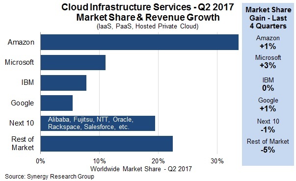 圖2:2017年第二季度,云基礎(chǔ)設(shè)施服務(wù)市場(chǎng)份額和營(yíng)收增長(zhǎng)數(shù)據(jù)