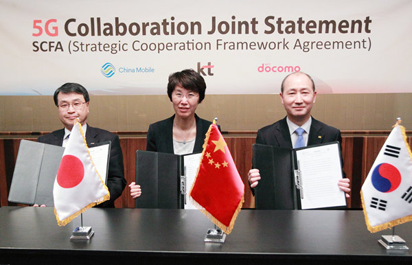 ICCSZ訊 3月1日,在世界移動通信大會期間(MWC),中國移動與日本NTT DOCOMO、韓國KT共同發(fā)布了由奚國華董事長、加藤薰社長、黃昌奎會長簽署的5G合作聯(lián)合聲明。