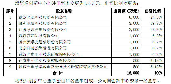 亨通光電完成增資后,創(chuàng)新中心的注冊(cè)資本變更為1.6億元,股權(quán)比例如下圖。