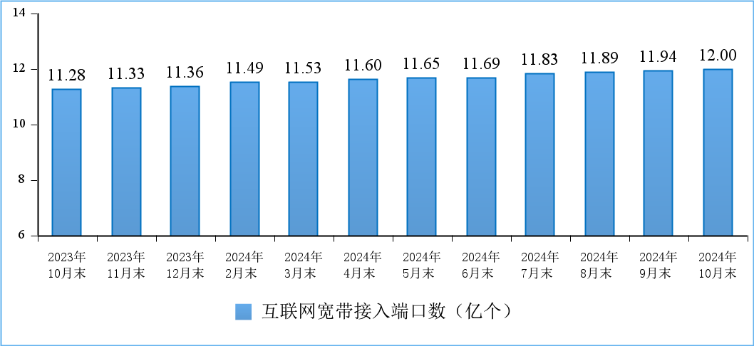 截至10月末,全國互聯(lián)網(wǎng)寬帶接入端口數(shù)量達(dá)12億個,比上年末凈增6370萬個。其中,光纖接入(FTTH/O)端口達(dá)到11.6億個,比上年末凈增6141萬個,占互聯(lián)網(wǎng)寬帶接入端口的96.4%。截至10月末,具備千兆網(wǎng)絡(luò)服務(wù)能力的10G PON端口數(shù)達(dá)2761萬個,比上年末凈增458.6萬個。截至10月末,5G基站總數(shù)達(dá)414.1萬個,比上年末凈增76.4萬個,占移動基站總數(shù)的32.8%,占比較上年末提高3.7個百分點。