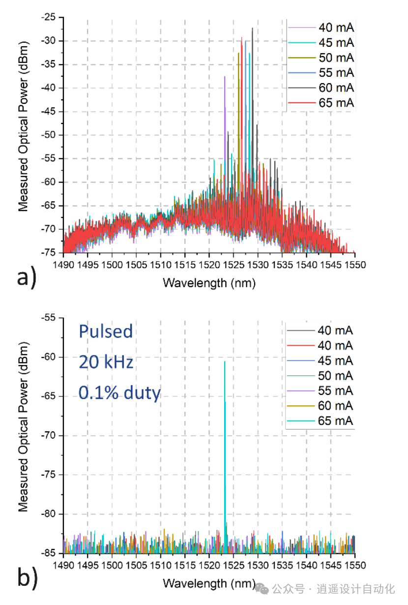 圖 2 - a) 在不同驅(qū)動電流下測量的一個 HECL 的單模激光光譜;b) 脈沖驅(qū)動電流(20 kHz 和 0.1% 占空比)下(a)中 HECL 的單模激光光譜。為了評估激光器的運行情況,對基于與 SiN 光學諧振器耦合的 μTP RSOAs 的全集成 HECL 進行了電氣和光學表征。圖 2 顯示了其中一個 HECL 在連續(xù)波(CW)和脈沖(20 kHz,0.1% 占空比)工作時測得的激光光譜。
