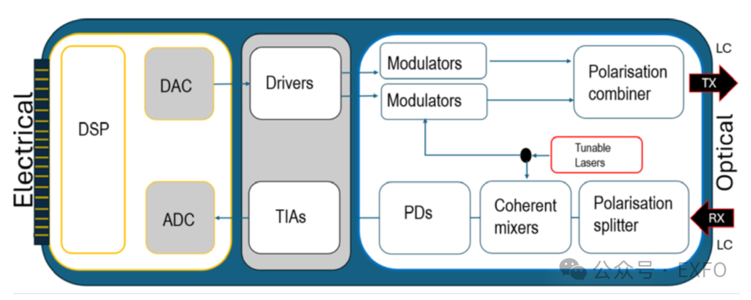 相干接收器必須能夠區(qū)分這些偏振態(tài)并將其分開,以準(zhǔn)確恢復(fù)傳輸?shù)臄?shù)據(jù)。當(dāng)光信號到達(dá)接收器時,光模塊使用與發(fā)射器所用可調(diào)諧激光器相同的本地振蕩器激光器,進(jìn)行相干檢測。它將入射信號與本地振蕩器的光結(jié)合起來,這個過程被稱為干涉。此過程使接收器能夠提取接收信號的幅度和相位信息,隨后這些信息由數(shù)字信號處理器(DSP)進(jìn)行處理。 DSP通過補(bǔ)償信號損傷和優(yōu)化信號質(zhì)量,在精確重建傳輸?shù)臄?shù)據(jù)方面發(fā)揮著至關(guān)重要的作用。