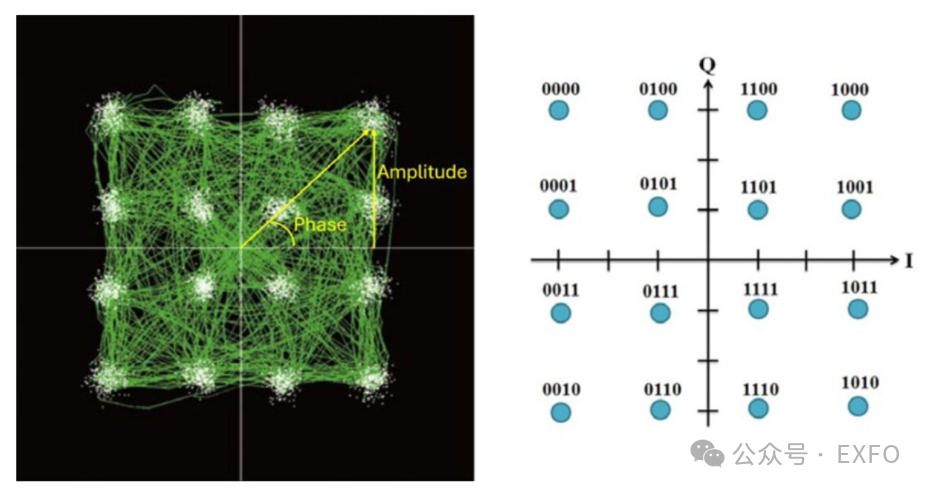 除了調(diào)制,偏振在相干傳輸中也起著關(guān)鍵作用。光經(jīng)過偏振,這意味著其電場在特定方向上振蕩。通過在兩個正交偏振(垂直和水平)上對獨立的數(shù)據(jù)流進(jìn)行編碼,偏振復(fù)用可將傳輸容量翻倍。圖4顯示的是16 QAM相干信號星座圖。