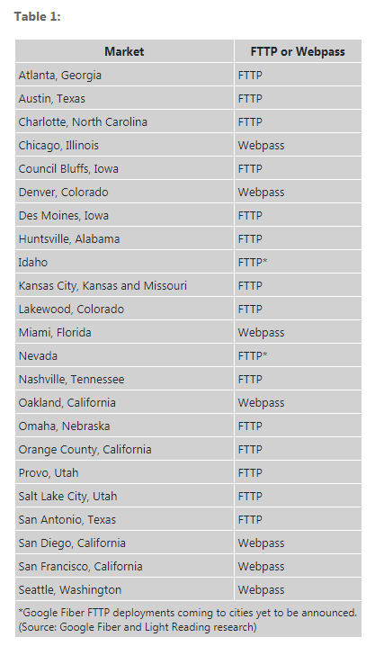 以下是谷歌Fiber目前和計(jì)劃的服務(wù)部署的更新列表,如果部署集中在FTTP或Webpass固定無(wú)線接入平臺(tái):