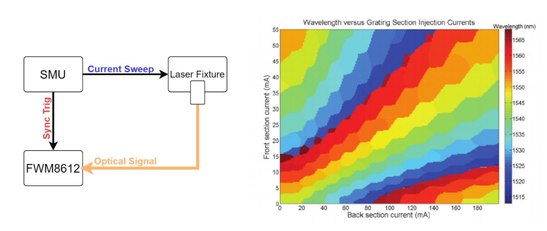 可調(diào)激光器的modemap掃描和通道校準(zhǔn):使用SMU與FWM8612同步掃描可調(diào)激光器,同步測量速率高達(dá)1000Hz,實(shí)現(xiàn)modemap的精確掃描和通道校準(zhǔn)同步進(jìn)行,大大縮短了可調(diào)激光器的校準(zhǔn)周期。
