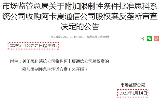 附鏈接:市場監(jiān)管總局關于附加限制性條件批準思科系統(tǒng)公司收購阿卡夏通信公司股權案反壟斷審查決定的公告