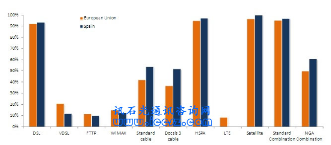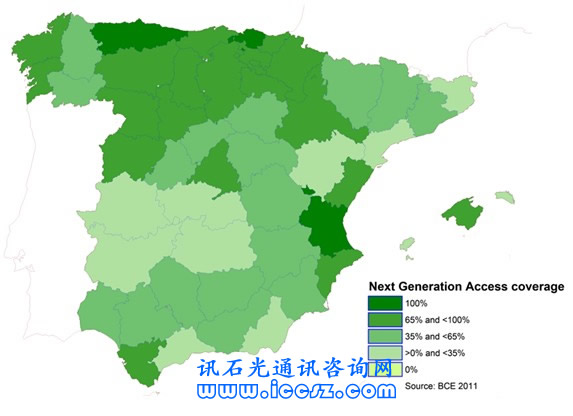 《2011歐洲寬帶覆蓋》調(diào)研報告顯示,西班牙基本寬帶覆蓋率(至少提供144kbps的服務(wù),只要他們愿意)達97%,超高速寬帶(也稱為NGA,即下一代接入)覆蓋達61%。在調(diào)研的29個國家中(歐盟27國和挪威、冰島),96%能夠獲得基本寬帶,超過50%(一半國家走向2020數(shù)字天堂目標)能夠獲得超高速。