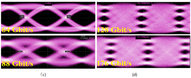 得益于優(yōu)良的材料質(zhì)量和器件制備技術(shù),器件在10 Hz至1 MHz頻率范圍內(nèi)的三角波電壓信號下的調(diào)制效率測量結(jié)果如圖2(b)所示,結(jié)果顯示在測量頻率范圍內(nèi)器件保持穩(wěn)定的VpiL值,約2.9 V·cm,與仿真值2.92 V·cm相接近。同時該結(jié)果展示器件具備較好的低直流漂移特性,證明薄膜鈮酸鋰材料和氧化硅包層的沉積質(zhì)量較好,缺陷較少。調(diào)制器的光眼圖測試結(jié)果如圖2(c,d)所示,在NRZ調(diào)制信號下傳輸速率達(dá)到88 Gbit/s, PAM-4調(diào)制信號下傳輸速率達(dá)到176 Gbit/s。