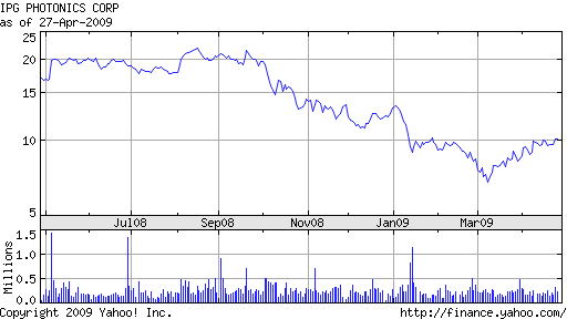 在光纖激光器市場,相比其他競爭者,IPG的優(yōu)勢在于擁有多于競爭者2-3年的研發(fā)經(jīng)驗(yàn)。因此,在目前經(jīng)濟(jì)衰退的情況下,IPG的市場份額開始擴(kuò)大。
