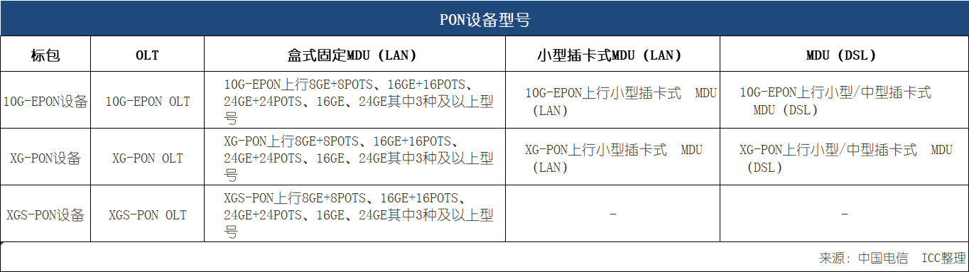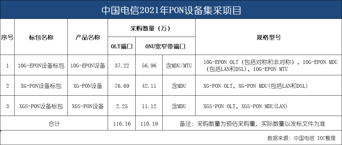 ICC訊(編輯:Aiur) 5月21日,中國電信發(fā)布PON設備(2021年)集中采購項目10G-EPON/XG-PON/XGS-PON標包資格預審公告,計劃采購10G-EPON/XG-PON/XGS-PON OLT端口設備和ONU寬窄帶端口設備,傳統(tǒng)GPON/EPON設備采購量為零。