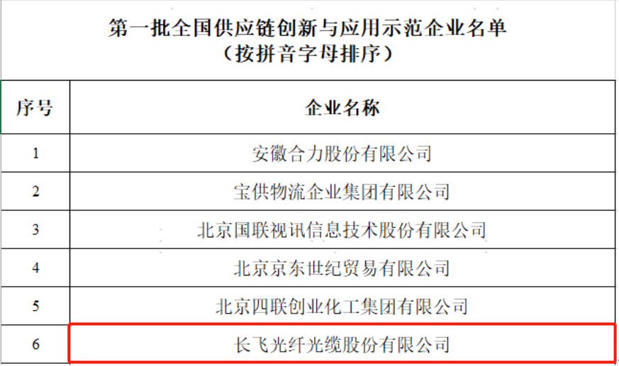 5月24日,商務(wù)部發(fā)布第一批全國(guó)供應(yīng)鏈創(chuàng)新與應(yīng)用示范城市和示范企業(yè)公示名單,在首批100家示范企業(yè)中,長(zhǎng)飛光纖光纜股份有限公司(以下簡(jiǎn)稱(chēng):“長(zhǎng)飛公司”,股票代碼:601869.SH、06869.HK)入選,為國(guó)內(nèi)光纖光纜行業(yè)唯一。