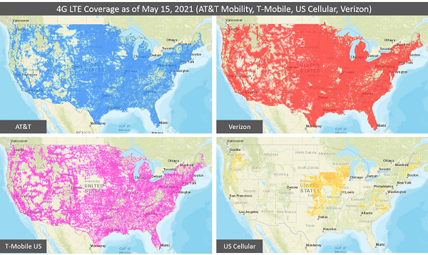 該地圖顯示了截至2021年5月15日,美國四大移動(dòng)運(yùn)營商的4G LTE寬帶數(shù)據(jù)和語音移動(dòng)覆蓋情況。這些數(shù)據(jù)是由這些運(yùn)營商自愿提交的,超出了FCC通過FCC Form 477接收數(shù)據(jù)的正常時(shí)間表。如果其他運(yùn)營商有興趣提供類似的自愿標(biāo)準(zhǔn)化資料,請(qǐng)與寬帶數(shù)據(jù)專責(zé)小組聯(lián)系。