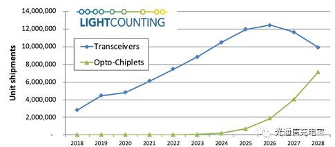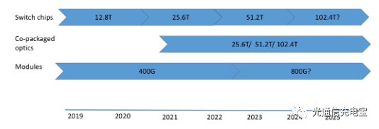 b) 光模塊技術(shù)的市場(chǎng)需求應(yīng)該會(huì)在2024年左右出現(xiàn)。兩方面原因,一是交換機(jī)容量到達(dá)51.2T的瓶頸會(huì)在2024年左右突顯,如圖8所示;二是Lightcounting機(jī)構(gòu)預(yù)測(cè)以太網(wǎng)數(shù)據(jù)中心光模塊需求量會(huì)在2026年下降,2024年光芯片組開始起量,隨后的較長的一段時(shí)間里與光模塊競爭并成功搶占大部分市場(chǎng)。